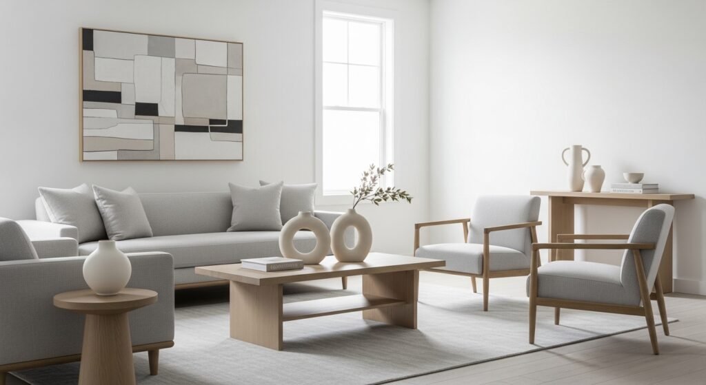 Minimalist decor often includes neutral colors, simple furniture, and modern decorative pieces that complement the overall design of the home.